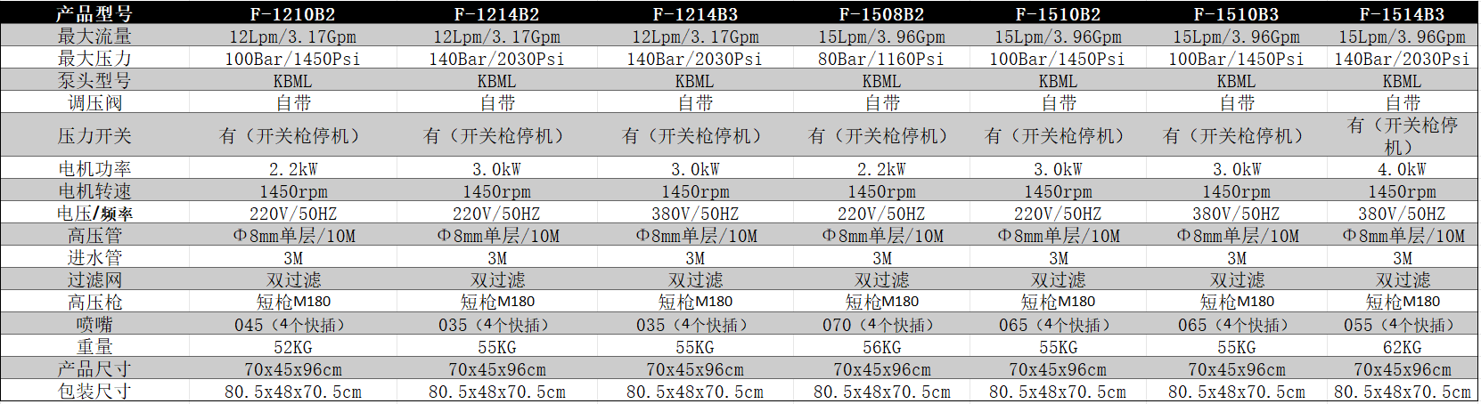 +? 肥肥-F 為商用冷水高壓清洗機,擁有專利外觀證書,新穎大氣。 +? 控制開關可全自動、半自動一體化設計,方便不同人的使用習慣。 +? 機罩采用PP材質,自帶小型儲物槽,經濟實用。 +? 自帶四種角度的噴嘴,分別為:0°、15°、25°、40°,滿足日常不同場景需求。 +? 可選配單相220V或三相380V的四極銅芯感應電機,動力強勁。 +? 采用原廠KBM系列經典高性能水泵,全銅高壓柱塞泵+自帶調壓閥,可調節(jié)壓力大小。